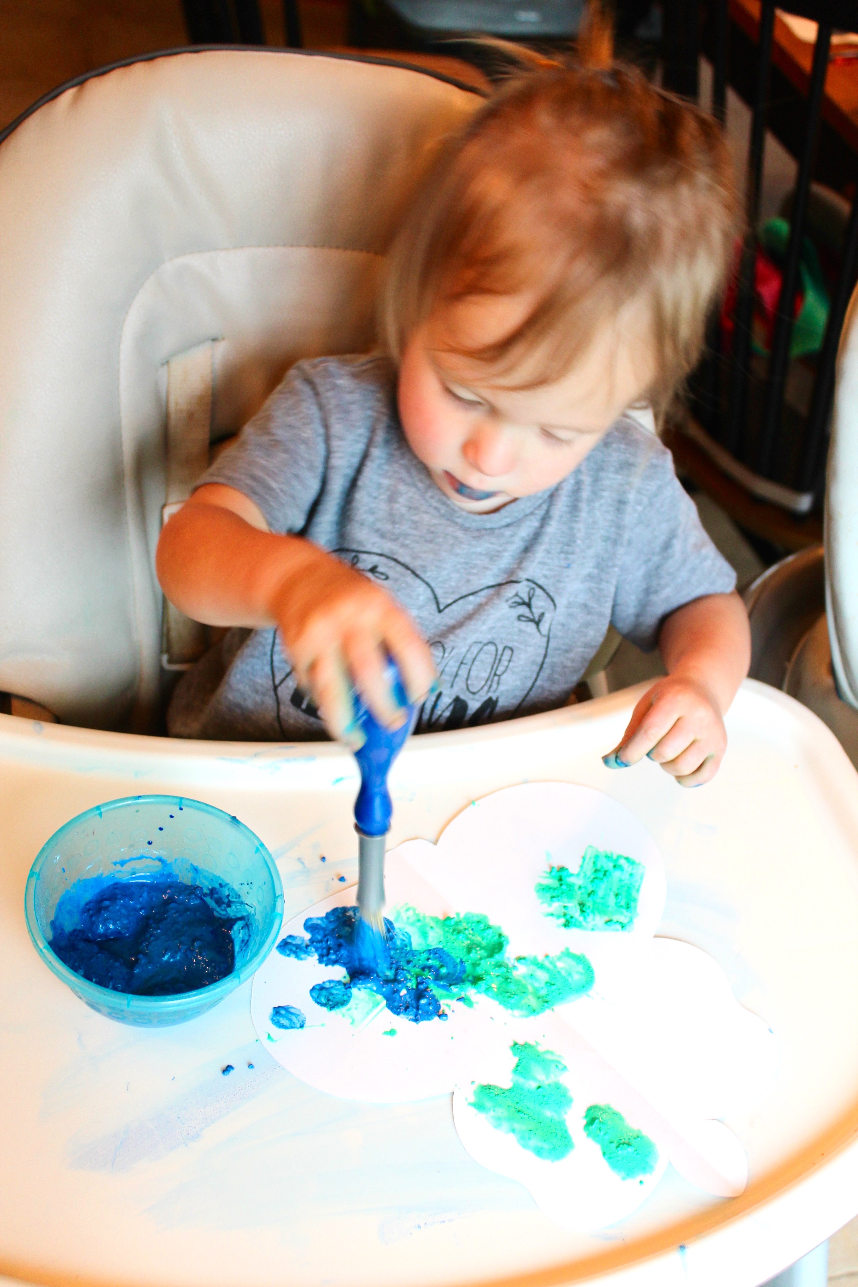 notes: i had this set up and ready to go so as soon as we were done with a painting activity, we could ‘wash off’ in the water. i used just enough watercolor to tint the water…not to stain!